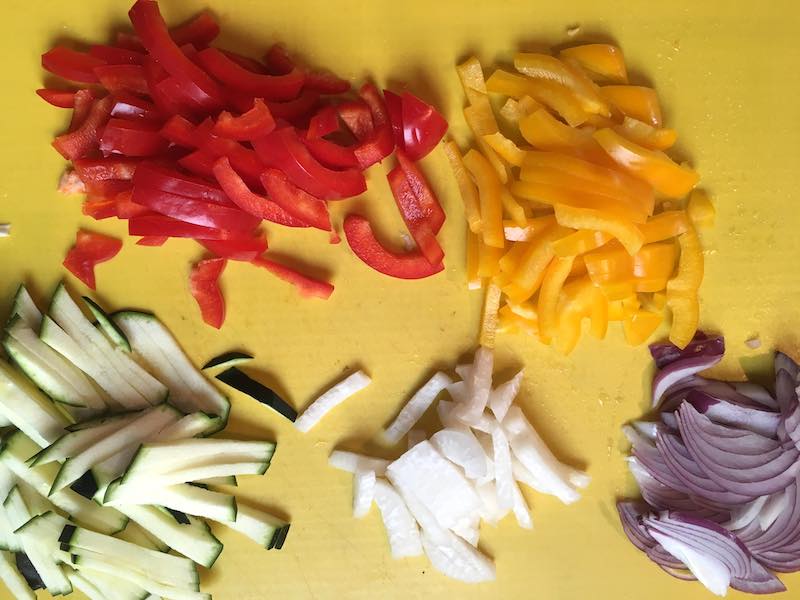 Zaczynamy od pokrojenia w zwykłe 1 cm plastry BAKŁAŻANA. Plastry kroimy w grube paski, jak …kurczaka. Lekko solimy, niech puści sok, który po pół godzinie spłukujemy. Warzywa ( z wyjątkiem grzybów) kroimy w zapałkę, i każde osobno lekko obsmażamy i podduszamy (ja lubię na półchrupiąco) na patelni lekko maźniętej olejem. Wystarczy doprawdy kilka kropel oleju, albo mazanie patelki pędzlem silikonowym) i do miski.